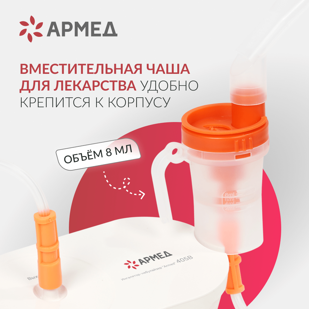 Чаша ингалятора вмещает 8 мл лекарственного раствора, что позволяет проводить процедуры большой длительности — тем более, что прибор поддерживает непрерывную работу в течение 40 минут. Крышка защищает чашу от протеканий, а система клапанов предотвращает потерю распыляемого препарата. Стенки чаши изготовлены из прозрачного пластика для визуального контроля за остатком лекарства.