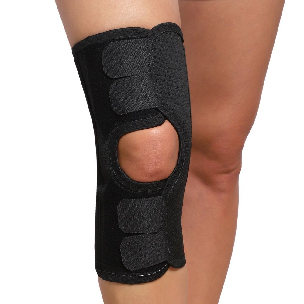Расположите бандаж на ноге так, чтобы отверстие находилось посередине коленной чашечки, а боковые шины — строго по наружной и внутренней поверхностям коленного сустава