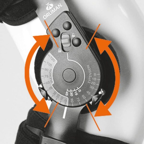 - В шарнире имеется переключатель, который приводит ортез в положение тутор (полная иммобилизация) одним нажатием.