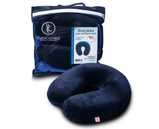 Ортопедическая подушка ORTOCORRECT «Турист» размером 27×27 см и высотой 10 см — анатомическая модель с эффектом памяти, разработанная для комфортного отдыха во время путешествий и в домашних условиях.